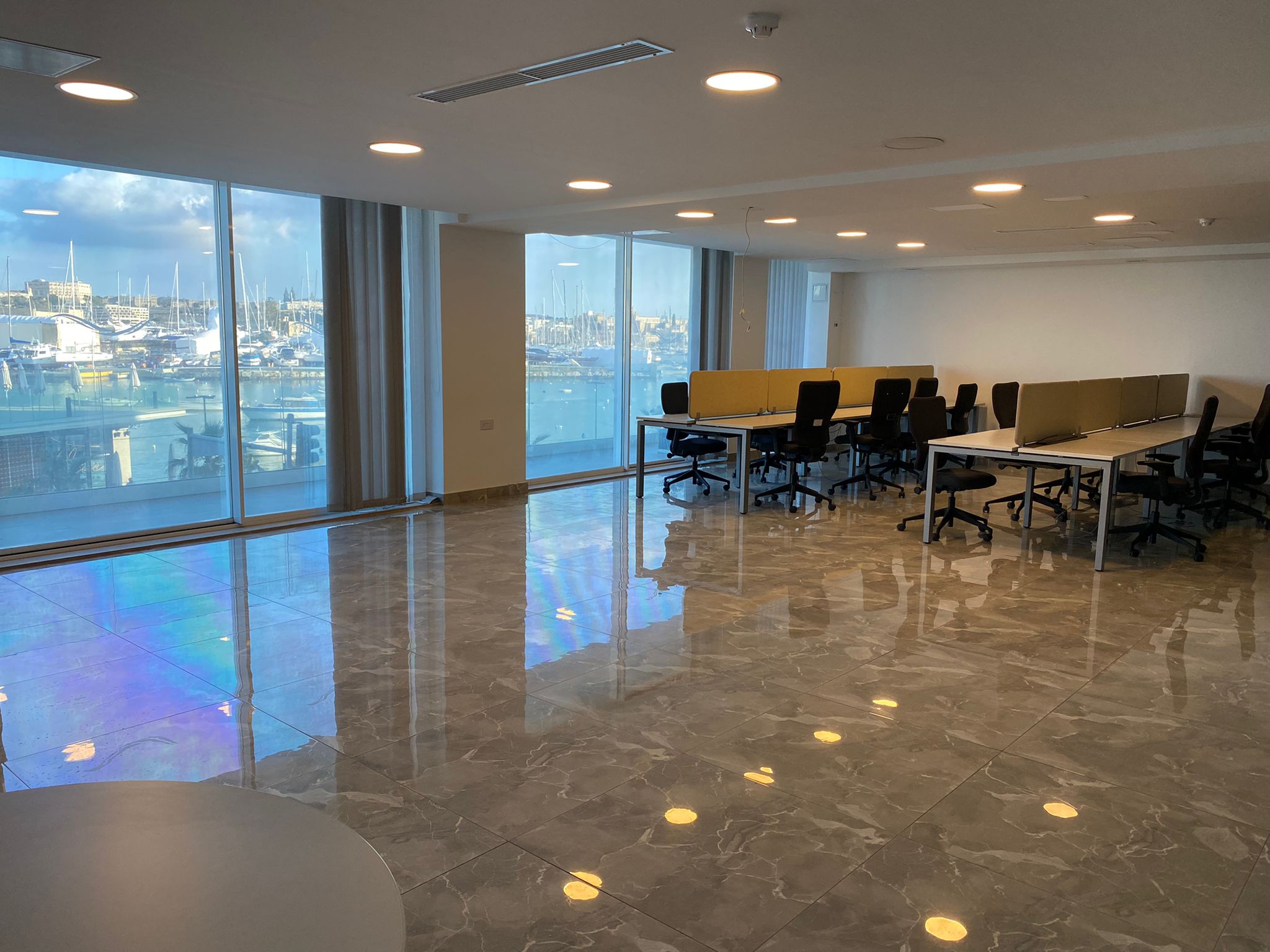 Highly finished fully furnished Office with spectacular views of the Historical buildings of Manuel Island, Malta’s capital city Valletta and the traditional Marsamxett harbour.